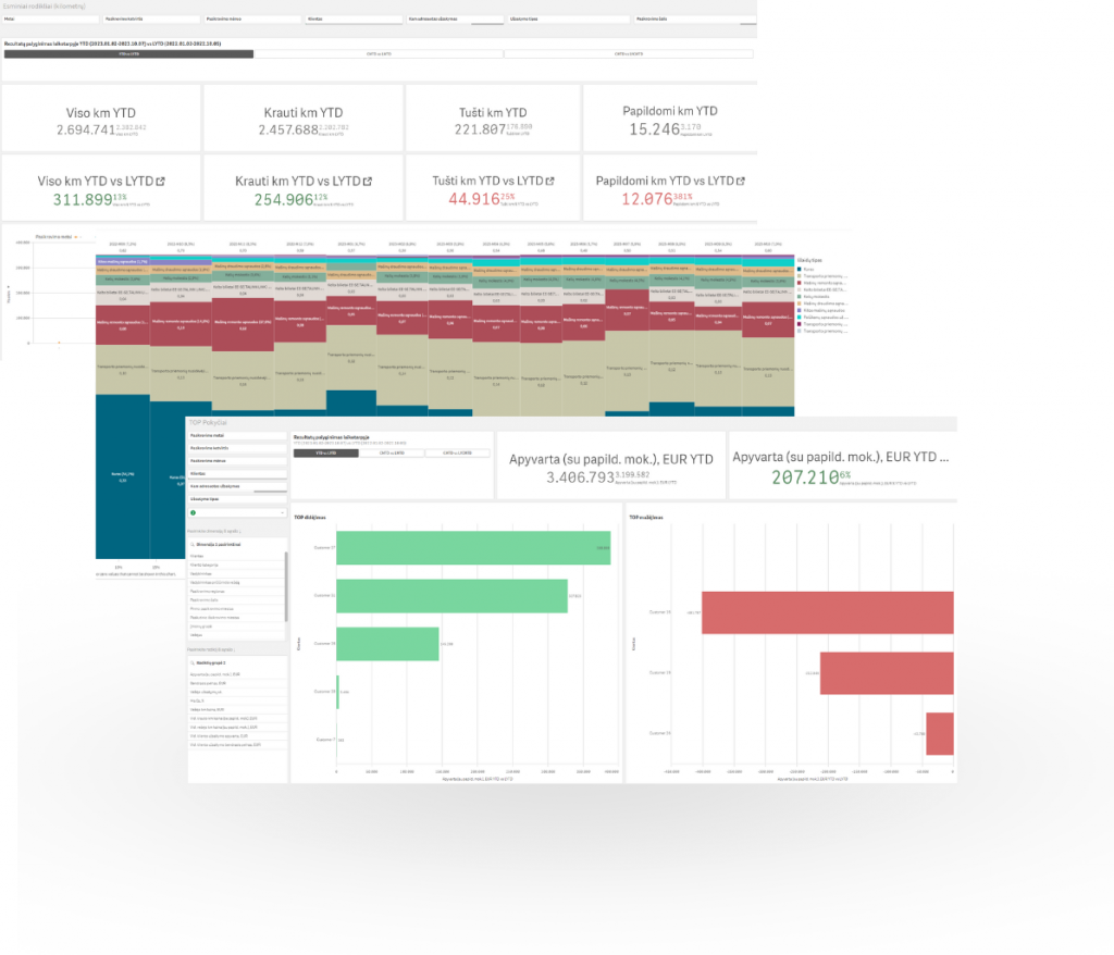 Pervežimo pelningumo, visų nuvažiuotų ir tuščių kilometrų analizė, kuro sąnaudų pagal automobilį / vairuotoją / dieną ataskaitų analitikos aplikacija. Pažangi verslo analitika transporto sektoriaus įmonėms. Analizuokite duomenis iš skirtingų šaltinių – matykite platesnį vaizdą ir sprendimus priimkite greičiau.